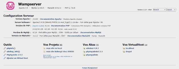A l'adresse Http://localhost, le site local présente la page d'accueil WampServer.