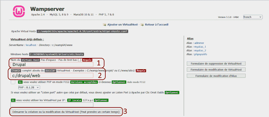 1. la zone de saisie "Nom du VirtualHost" (point 1 de l'image ci-dessous) en écrivant Drupal (par exemple) ;