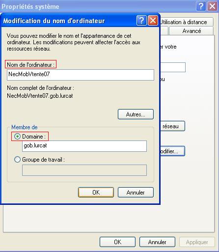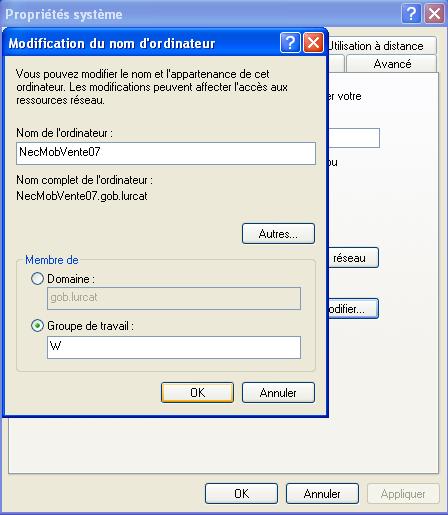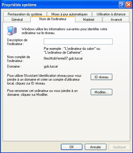 Faire un clic droit sur l'icône "poste de travail" et cliquez sur "Propriétés", puis dans la fenêtre "Propriété système" (illustrée dans l'image ci-jointe), cliquez sur l'onglet "Nom de l'ordinateur"