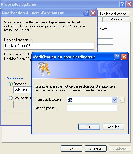Titulaire du droit "ajouter un ordinateur dans un domaine", il faut entrer votre "Nom d'utilisateur" ainsi que votre "mot de passe".