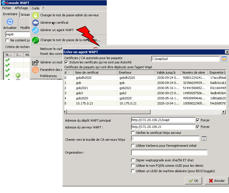 Ce programme se génère dans le menu "outils" de la console Wapt comme le montre l'image ci-dessous.