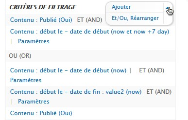 On observera que certains critères sont incompatibles et que le critère "contenu publié" est utilisé 2 fois. Cela s'explique par l'impossibilité d'imbriquer les parenthèses. L' écriture A et (B ou (C et D)) n'étant pas possible, nous devons utiliser une écriture de la forme (A et B) ou (C et D). Malheureusement ces deux formes ne produisent pas le même résultat.