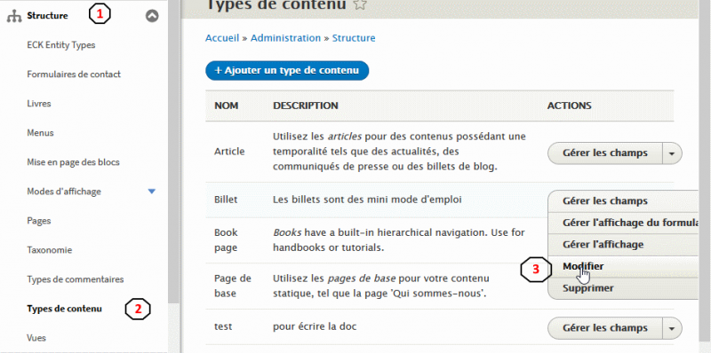 Cliquez sur le lien "modifier" associé au type de contenu dont vous souhaitez, supprimer les informations de publication (par exemple : articles) ;