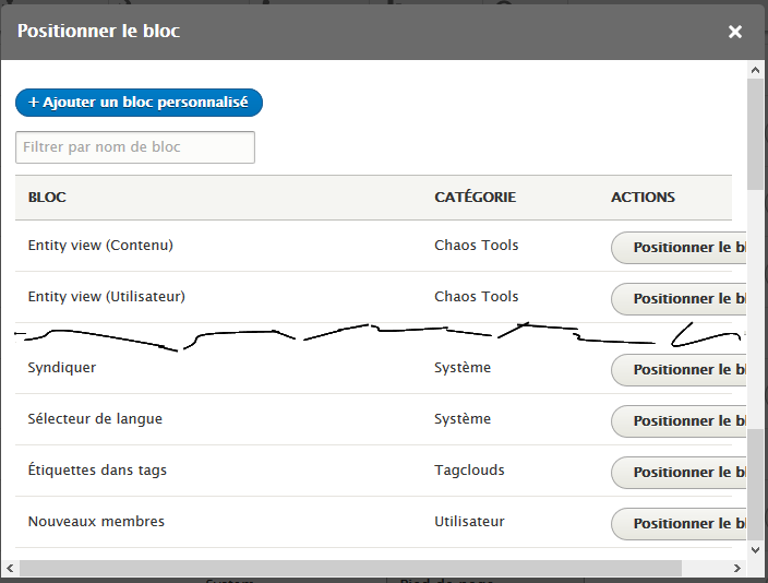 Dans la fenêtre "Positionner le bloc", repérer dans la colonne "catégorie" le terme "tagclouds" et cliquer sur le bouton "positionner le bloc" situé à sa droite.