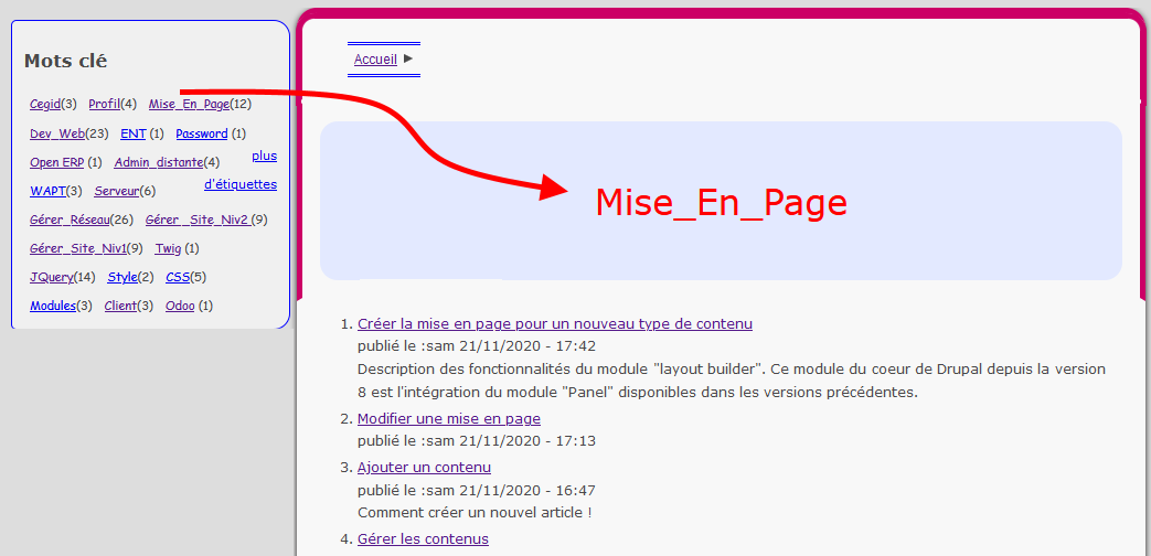 Lorsque l'on clique sur un des mots clé, la page associée s'ouvre. En fonction du paramétrage expliqué au paragraphe suivant, cette page pourra afficher la liste des pages où figure ce mot clé et le résumé de cette page si celui-ci a été rédigé lors de la création/modification de la page.