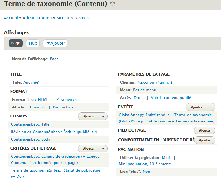 Ceci est visible dans la partie "CHAMPS" de l'image. L'URL associée est "/admin/structure/views/view/taxonomy_term" et permet de paramétrer la vue "terme de taxonomie".