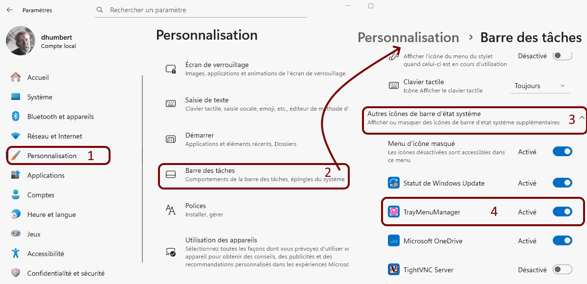cliquez sur "Barre des tâches", puis faire défiler pour visualiser le menu "Autres icônes de la barre des tâches" ;