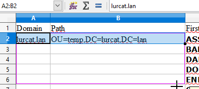 P : SamAccountName (le nom d'ouverture de session ou login. J'utilise la formule de concatenation suivante CONCATENER(GAUCHE(C2;9);".";GAUCHE(D2;9)) qui fournit le login à partir des 9 premières lettres du nom et des 9 premières lettres du prénom ;